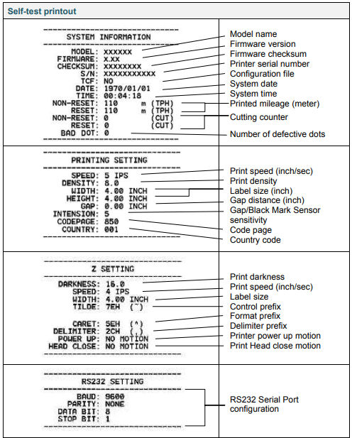 Print the printer configuration after you run Gap/Black Mark Sensor calibration. The self-test printout lists the printer’s configuration and available memory, and can indicate if there is any dot damage on the heater component.