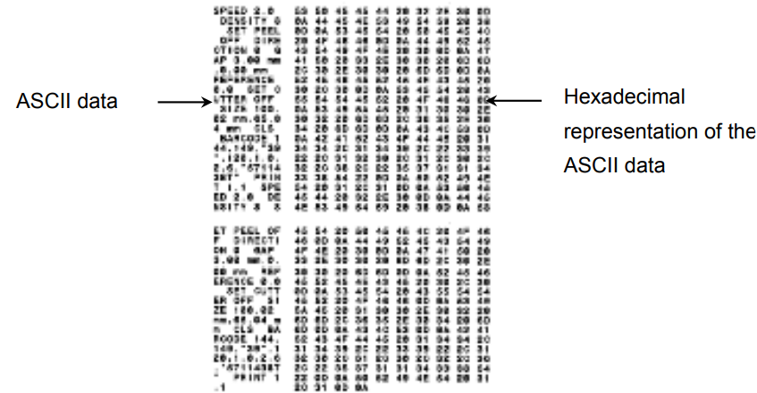 The printer enters Dump Mode after printing the printer configuration. Dump Mode allows users to verify and debug the printer’s programs. The characters in the left column are received from the printer’s system, and those in the right column are their hexadecimal representation.