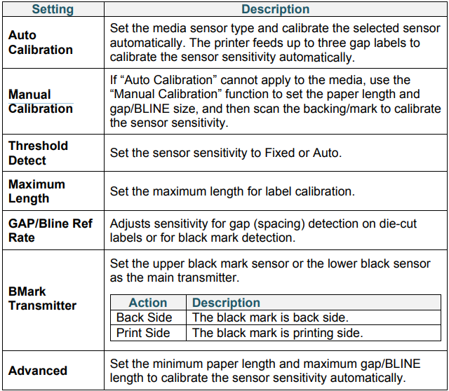 Use the BPM to set the media sensor type (Gap Sensor or Black Mark Sensor) and calibrate the selected sensor.