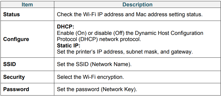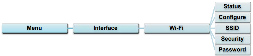 Configure your printer’s Wi-Fi connection and check its status. To use this feature, set up the Enterprise configuration using the Brother Printer Management Tool (BPM). For more information on setting up Wi-Fi using the BPM, see the Brother Printer Management Tool Quick Start Guide on your model’s Manuals page at support.brother.com. When the Wi-Fi Interface is connected, the Wi-Fi icon and IP address appear on the screen as shown below.