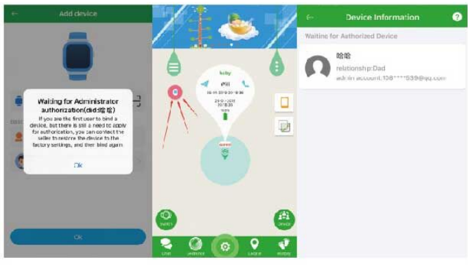 If a watch has already been registered, the first person to register is the main administrator. If you wish to add another trusted person (e.g., other parent) to bind the KidoCall to their APP, they will require the main administrator account to authorize this action. When the secondary administrator account binds the device, the interface notifies the applicant to wait for authorization. The notification is received by the primary administrator, who can authorize the secondary administrator to manage the device.