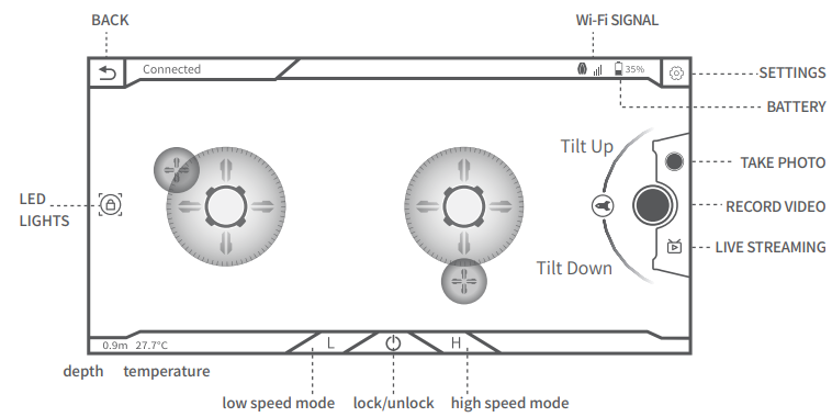 Open the App, when you see “connected” in the bottom left corner, click “start” on the right. Now you will see the main App interface (below). Click the power button to unlock the drone and use the virtual joystick on screen to control the drone’s movement.