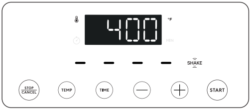 - Set the air fryer on a hard, flat surface and plug it in. The control panel will illuminate, and the default temperature and time (400˚F and 15 minutes, respectively) will alternate on the display.