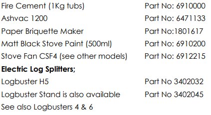 Refer to the CLARKE website www.clarkeinternational.com for a full range of Flue Pipes & Cowls for use with this classic cast iron stove. See also the following accessories;