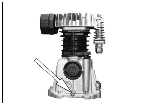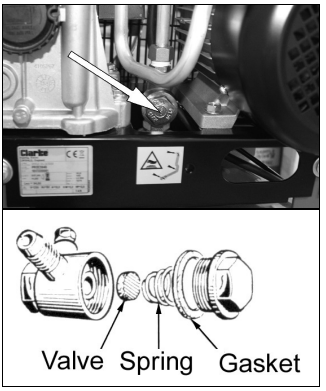 After the first 100 hours of use, replace the oil using Clarke SAE30 compressor oil. Then replace the oil after every 500hours of operation or every 6 months. To empty the oil from the machine, remove the oil drain plug from the crankcase.