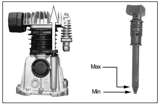 Ensure the oil level is between the min and max marks on the dipstick. See “Check the Oil level” on page 6 and top-up if necessary – (use Clarke SAE30 compressor oil, available from your local dealer).