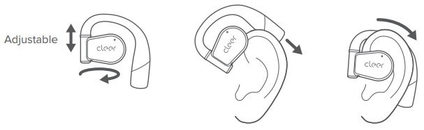 Rotate the earhook hinge and slide the earhook behind your ear until it rests gently over the top of your ears. If you feel uncomfortable or unstable, stretch the hinge appropriately to find the position that works best for you.
