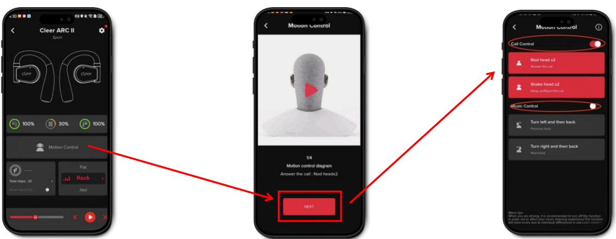 • [Settings] → [Motion Control] → Toggle the [Call Control] or [Music Control] button to turn on/off