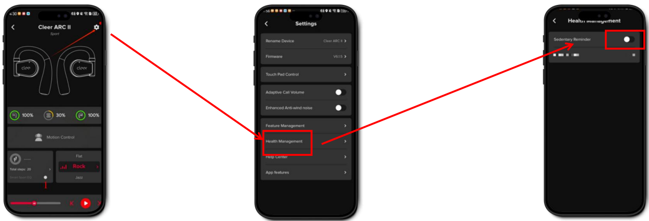 2. Other functions related to motion control (sedentary reminder/adaptive sport sound effects/step counting and management) are also deactivated by default. Activate or deactivate it in the Cleer+ App.