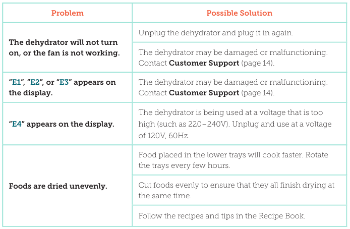 - Overheating is extremely rare. If the dehydrator overheats, it will automatically shut down as a safety feature and will no longer turn on. Contact Customer Support (page 14).
