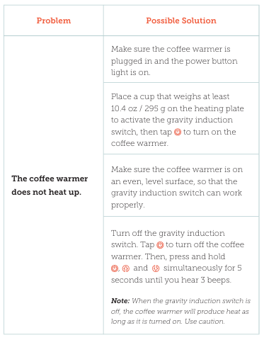 - The gravity induction switch is a safety feature that stops the coffee warmer from producing heat when there is no cup on the plate.