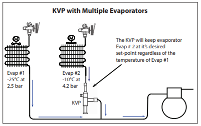 - If the chambers have different operating setpoints (different evaporation temperatures, such as, for example, a cooling chamber and a freezing chamber), it is mandatory to use a KVP valve according to the diagram below. In case of any doubts, please refer to the KVP application guide available in the Danfoss Product Store.