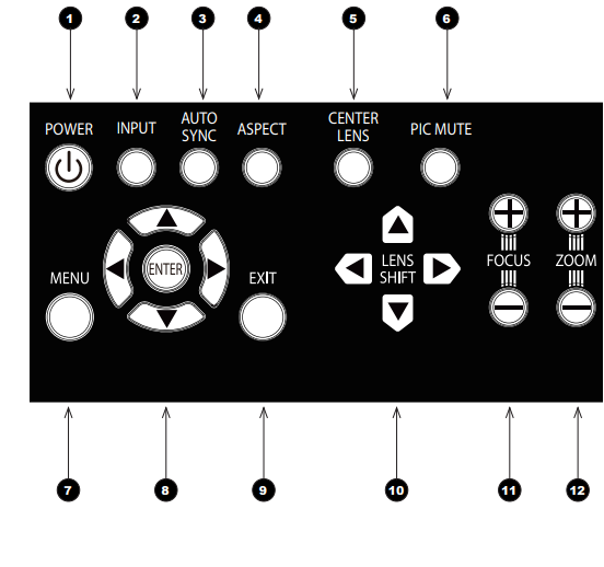 10. LENS SHIFT arrow buttons. Each of these buttons moves the lens in the specified direction.
