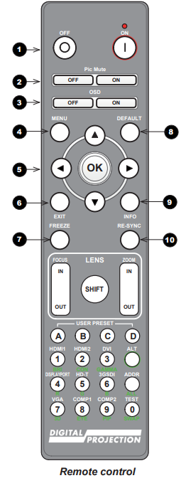 7. RE-SYNC Re-synchronise with the current input signal.Digital-Projection-E-Vision-Laser-7500-Projector-fig-8