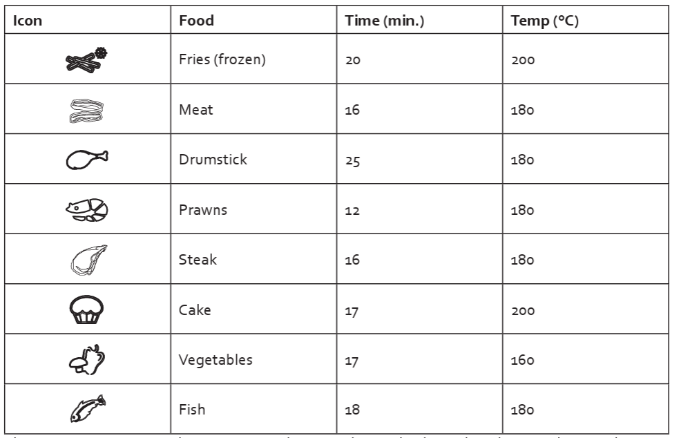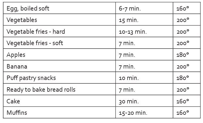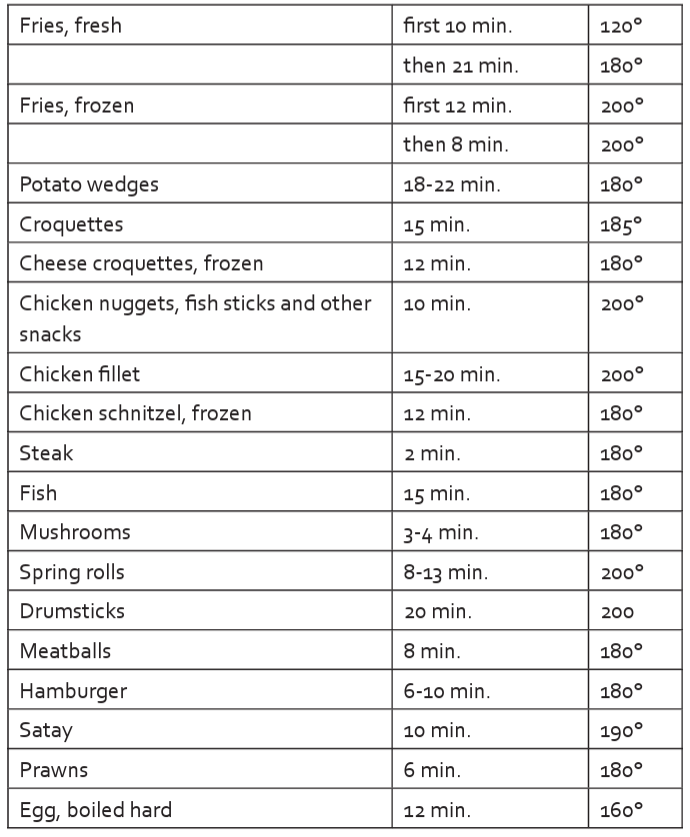The table below holds a few guidelines for cooking and frying different ingredients. Caution: these are merely guidelines. The times also depend on the quantity and thickness of the food. Also, always take into account the above-mentioned frying tips.