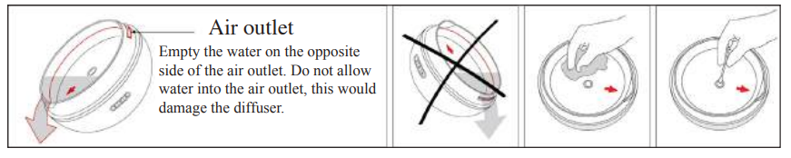 - Remove the covers and pour the water into the tank. Empty the water in the opposite way to the air outlet; do not empty the water in the air outlet, this would damage the diffuser.