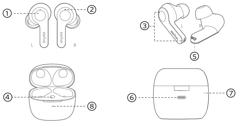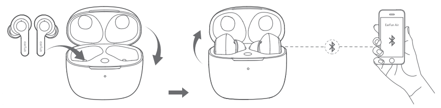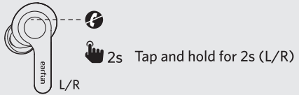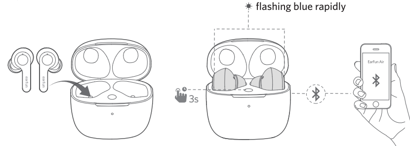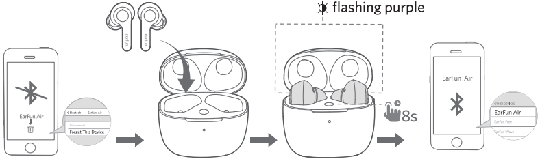 - With the charging case open, press and hold the charging case button for 8 seconds until both LED indicators on earbuds flash purple quickly. Wait for 3s and then connect to “EarFun Air”