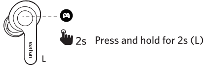 - Turning on the game mode can drop latency to as low as 100ms and improve the gaming and video experience, but it will shorten the connection distance. We suggest you turn off the game mode when you use the earbuds for music.