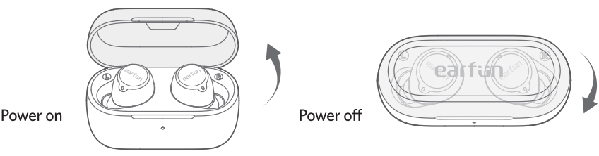 Open the charging case, and the earbuds will automatically power on. Place the earbuds back into the charging case and close the case, then the earbuds will automatically power off.