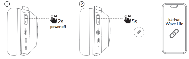 Step 2: Then press and hold the MFB button for 5 seconds, and the headphones will power on and go into pairing mode.