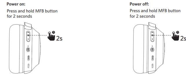 1. Press and hold the MFB button for 2 seconds to power off the headphones.