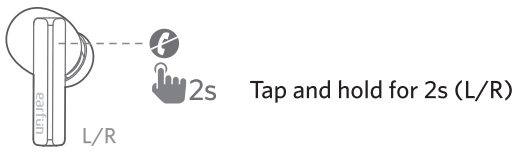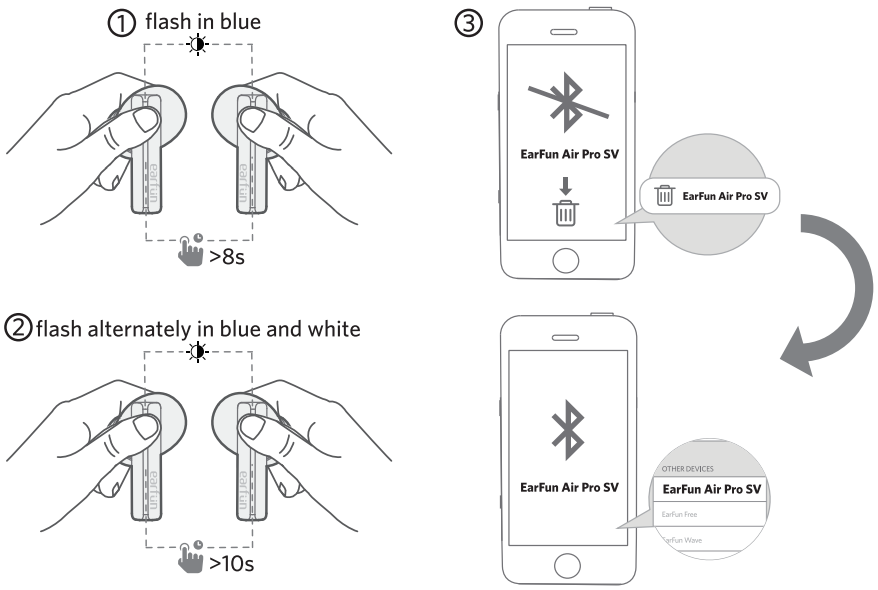 • In power-off mode, touch and hold the button on each earbud at the same time for at least 10 seconds until they flash alternately in blue and white, then the earbuds have been reset successfully.