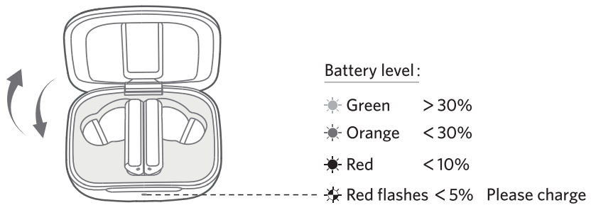 • The charging case is not waterproof. The earbuds will remain on as long as they are connected to a device. If no audio is in use, they will enter power-saving mode and wake up once audio is played. If the earbuds are not connected to any devices, they will automatically shut off in 30 minutes.