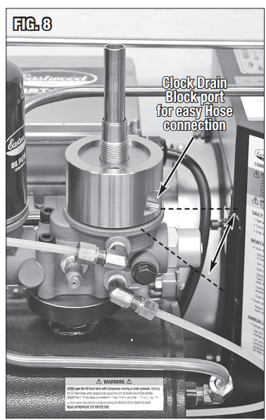 - Lubricate the Seal on the bottom surface of the Moisture Drain Block [A] with a thin layer of oil. With the Seal facing down, thread the Moisture Drain Block onto the Standpipe. Use of a blue thread locking compound is recommended. Tighten by hand until snug with the Drain Block port clocked for easy Check Valve and Hose installation (FIG 8).
