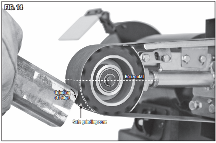 - Only work off the lower half of the Contact Wheel (FIG. 14). The upper half will tend to grab and kick the workpiece into you.