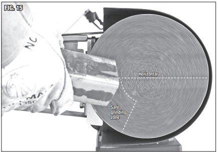 - Only grind on the downward rotating side of the Disc. Elsewhere will tend to kick the workpiece out of your hands or in a hazardous direction FIG.G 15).