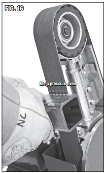 - The slack side of the Abrasive Belt is excellent for making smooth, rounded grinds, but too much pressure will put undue strain on the Belt, and uneven pressure will cause the Belt to track off the Contact Wheel. Be careful using the slack side. Don’t apply too much pressure, keep it evenly distributed, ted, and let the abrasive do the work (FIG 16). Be cautious when using sharp edges to avoid making tears in the Belt.