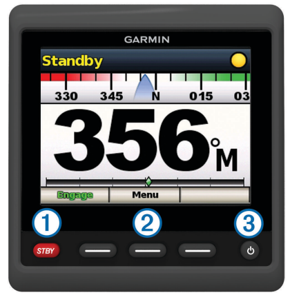 The autopilot does not steer the boat in standby mode. You are responsible for controlling the helm when in standby mode. In standby mode, you can engage the autopilot and adjust settings. “Standby” appears in yellow, and the yellow LED indicator appears in the upper-right corner of the screen when the device is in standby mode.