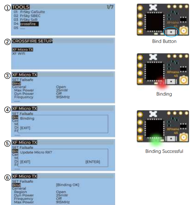 - For Taranis X9D/X9D Plus/X9E and Taranis QX7, turn on the transmitter, go to the TOOLS – CROSSFIRE SETUP – XF Micro TX, and select Bind.
