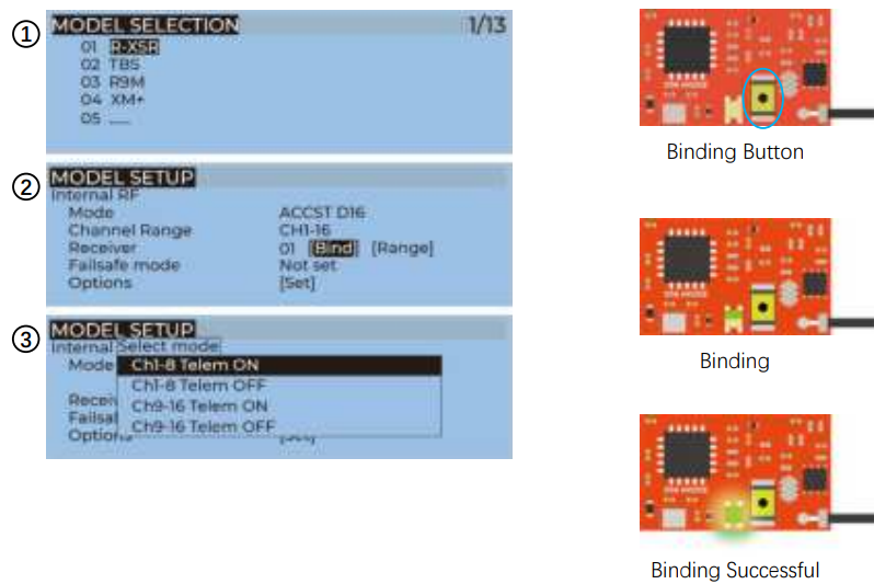 - For Taranis X9D/X9D Plus/X9E and Taranis QX7, turn on the transmitter, go to the MENU – MODEL SETUP – PAGE 2, choose Internal RF, and select BIND.