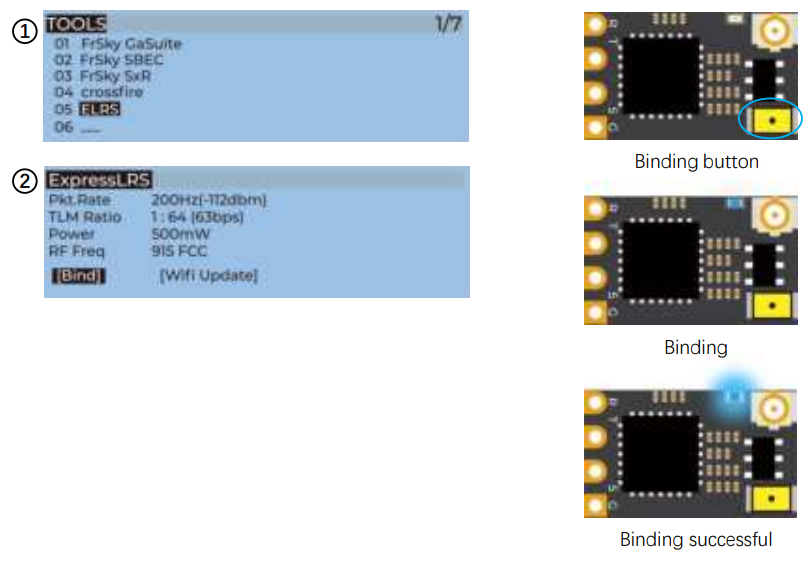 - For the X9D / X9D Plus / X9E and Taranis QX7 remote controller, turn on the remote controller, long-press the menu key to enter tools – ELRS, and select [Bind].