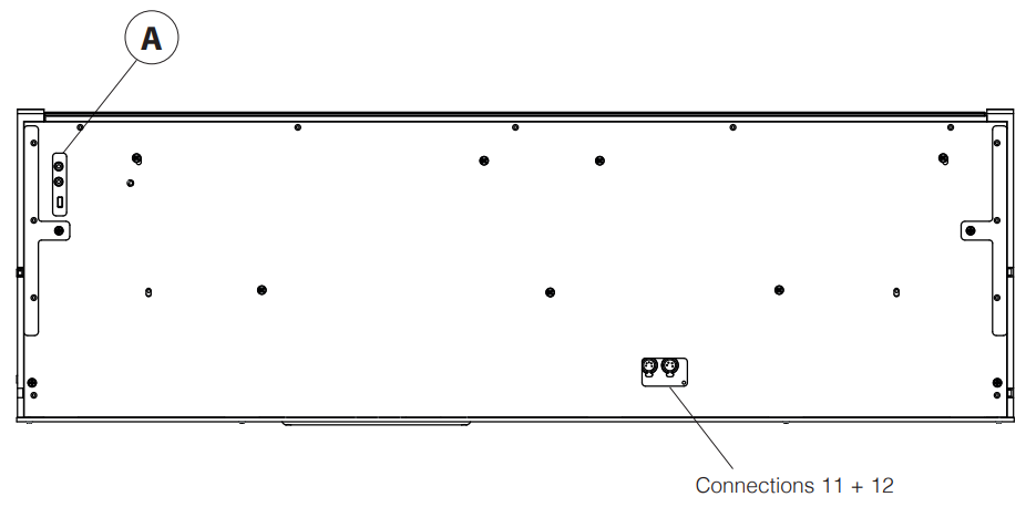 - Connect the cables for the Pedal and Subwoofer (11 and 12) to their matching ports on both the pedalboard and keyboard. Now attach the Subwoofer cover (6). Move it past both the following front panels 4 and 5. No screws are needed for the Subwoofer cover. The cover is held in place by magnets.