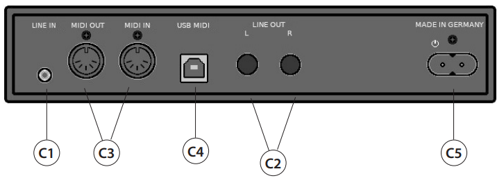 - C3 MIDI IN/OUT Connect MIDI devices here..