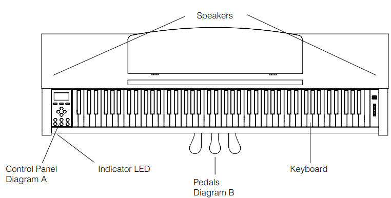 - The digital piano must be placed on securely fastened and weight-suitable, stable, and level floors or platforms.