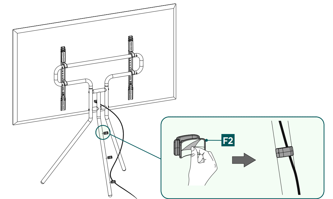 - Attach the supplied cable clips [F2] to the centre leg as shown in the illustration and then feed the cables through.