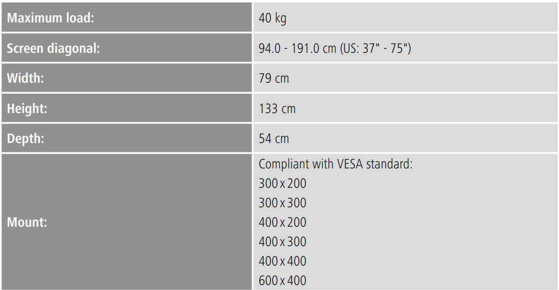 TVs weighing up to 40 kg (88 lbs) can be supported by the stand. Prior to installation, always check the weight of your TV.