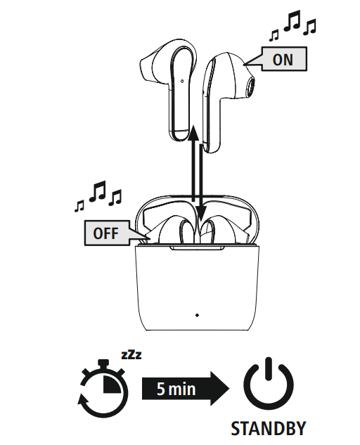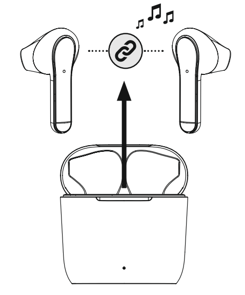 Remove the two headphones simultaneously from the charging box. Both earphones switch on automatically and start the pairing proce.ss