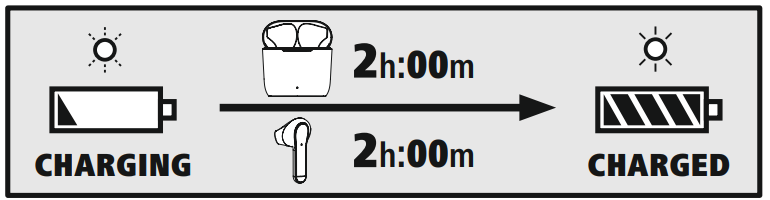 The status LED on the charging box (2) flashes red during the charging process. Once the charging box is fully charged, the charging box LED (2) lights up red. It can take up to 2 hours (earphones and charging box) until the batteries are fully charged.