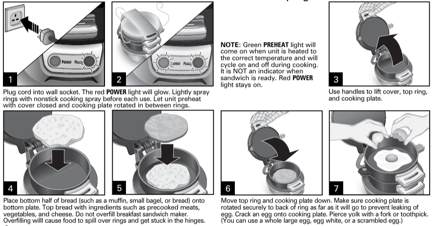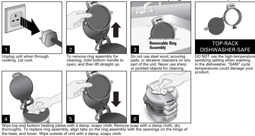 BEFORE FIRST USE: Lift cthe over to remove the ring assembly. Wash the removable ring assembly in the dishwasher or in hot, soapy water. Rinse and dry. Wipe top and bottom heating plates with a damp, soapy cloth. Remove soap with a damp cloth; dry thoroughly. Spray rings with nonstick cooking spray or wipe or brush with vegetable oil.