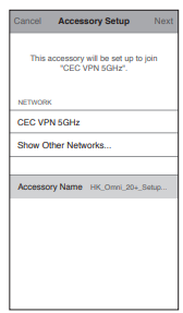 Omni 10+ and Omni 20+ use a new iOS feature named Wireless Accessory Configuration, which is the easiest way to set up Wi-Fi for iOS users. Each speaker you have plugged inintoC power will appear on this screen. Select one of the speakers, and an iOS system pop-up will appear, showing you a list of Wi-Fi networks in range. Choose the Wi-Fi network you want to connect this speaker to, then press Next. This should normally be the same network your phone is connected to, which will appear as the default option.