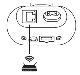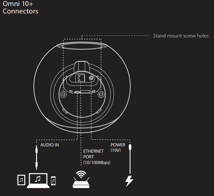 Although Omni 10+ and Omni 20+ are Wi-Fi-enabled speakers, Ethernet offers the fastest, most stable connection. If you are placing a speaker in a location where connecting it to the network via Ethernet is convenient, just connect a standard Ethernet cable to the Ethernet connector on the bottom of the speaker. No additional Wi-Fi setup is required. Ethernet can also be used to connect speakers that are out of Wi-Fi range.