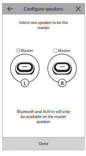 - The final step is to assign one of the speakers in the pair to be the Master speaker. You must connect any AUX-in devices to this Master speaker, and you may only pair with Bluetooth to this speaker.