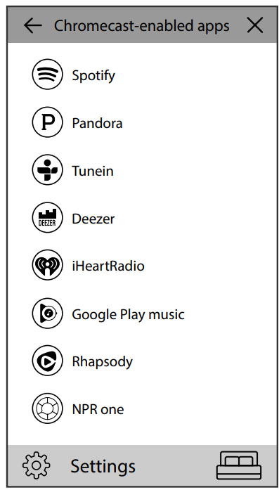 Chromecast built-in works very similarly to Spotify Connect, except it is supported by a large and growing number of music apps and services. If the music app you are using supports Chromecast built-in, you will see the Cast button in that app.