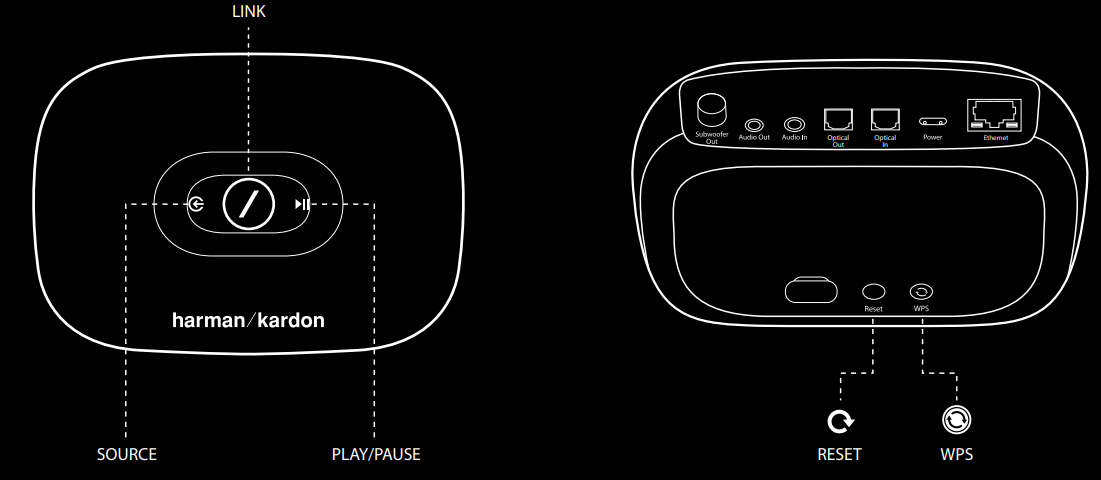 The Play/Pause button pauses or resumes music playback on Bluetooth or any of the Wi-Fi sources, including Spotify Connect and Chromecast built-in. AUX-in audio must be paused from the external audio source.