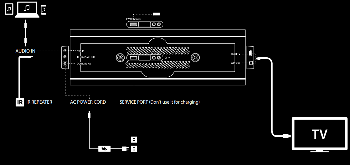 If your Omni Bar+ blocks the IR remote control for your TV, you can connect the included IR transmitter to this connector. Place the other end of the IR transmitter close to your TV, and you will again be able to use your TV remote control.
