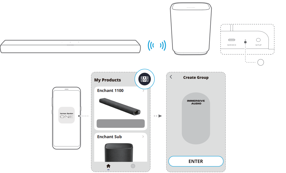 With the Harman Kardon One app on your Android™ or iOS device, you can set up a multi-channel sound system by wirelessly pairing your Enchant Sub with: